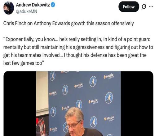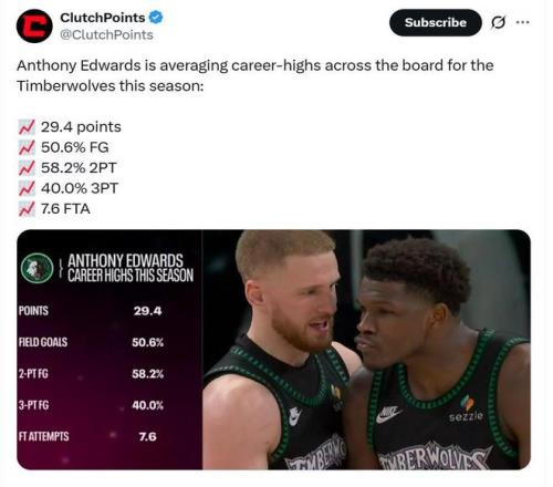 在休赛期放走重要轮转亚历山大沃克同时未能完成补强的情况下,森林狼队之所以还能高歌猛进,核心爱德华兹的持续蜕变与成长是关键。