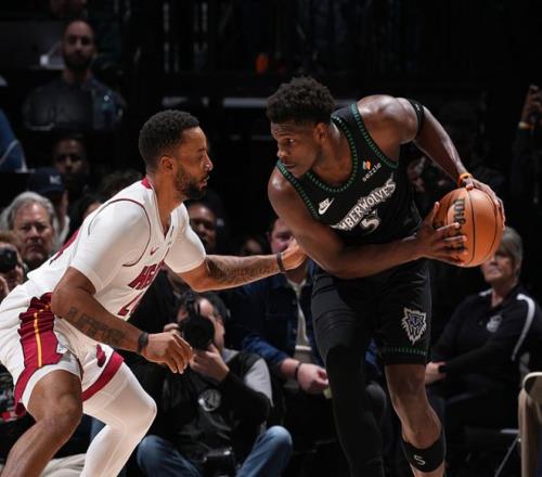 森林狼主场迎战热火,森林狼方面香农缺阵,热火方面哈克斯缺阵,首节比赛热火稍占上风,取得2分领先,从第二节开始森林狼完胜热火,最终森林狼大胜28分。爱德华兹18中8(三分8中5)得到26分5板3助2帽,兰德尔12中6得到15分11板5助,戈贝尔6中5得到13分17板2帽,热火方面鲍威尔17中9(三分6中3)得到21分3板4助,希罗15中7得到17分9板3助。