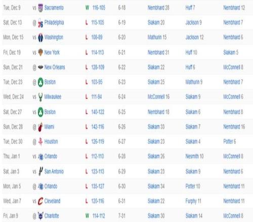 2025年12月9日击败国王后卡莱尔就拿到999胜,结果步行者吞下了一波13连败,这是步行者队史最长的连败,大家可以看到这一波13连败有5场分差只有8分左右,甚至有三场分差只有2分,说明步行者在决胜时刻就有意放水输球。