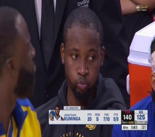 在上场比赛中,巴特勒因右膝前交叉韧带撕裂而赛季报销,人手短缺的勇士队在本场比赛启用了此前已被DNP16场比赛的前锋库明加。全场比赛,库明加出场21分07秒,10投7中高效得到20分5篮板2助攻1抢断,三分球3中1,罚球8中5,出现了2次失误和1次犯规,正负值为+3。