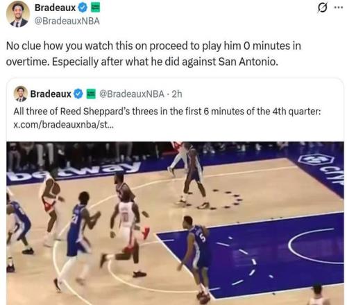 赛后火箭媒体人Bradeaux都对此感到不解,发文表示:“我实在搞不明白你们在想些什么,居然加时赛一分钟也不给谢泼德打,要知道他才在对阵马刺的比赛中交出那么亮眼的表现。”