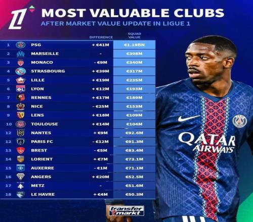 而另外的巴黎攻击手包括杜埃、克瓦拉茨赫利亚和登贝莱的身价分别是9000万到1亿欧元,分列法甲的个人身价排行榜3到5位的。除了他们阿什拉夫·哈基米、努诺·门德斯、帕乔、巴尔科拉的身价为7000万到8000万,他们分列这6到10位的。也就是说整个法甲前10名有9名是巴黎队员,由此可知,他们对这项赛事的统治的确是有根基的。