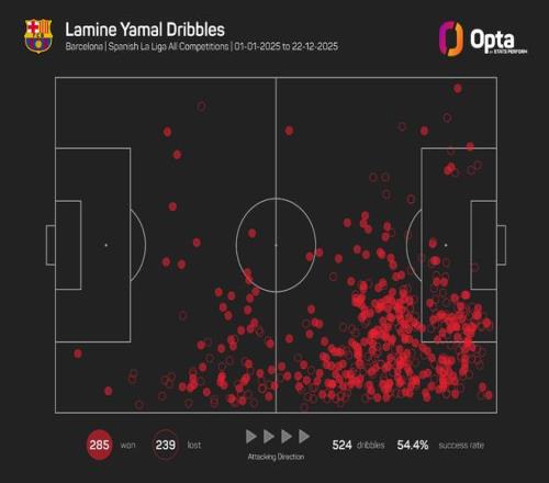 亚马尔一共尝试了524次过人,成功285次,过人成功率达到54.4%。此外,亚马尔的过人基本都在他所处的右边路完成。