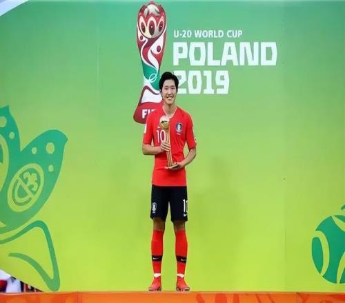 2019年波兰U20世界杯,18岁的李刚仁身穿10号球衣率领韩国U20闯入决赛,虽最终不敌乌克兰U20,但他凭借7场2球4助的出色发挥,成功收获U20世界杯最佳球员(世青赛金球奖)。
