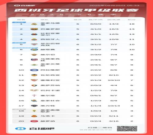 直播吧09月25日宣 西甲3场比赛战罢,马竞3-2绝杀巴列卡诺,皇家社会1-0马洛卡,赫塔菲1-1阿拉维斯,最新积分榜如下: