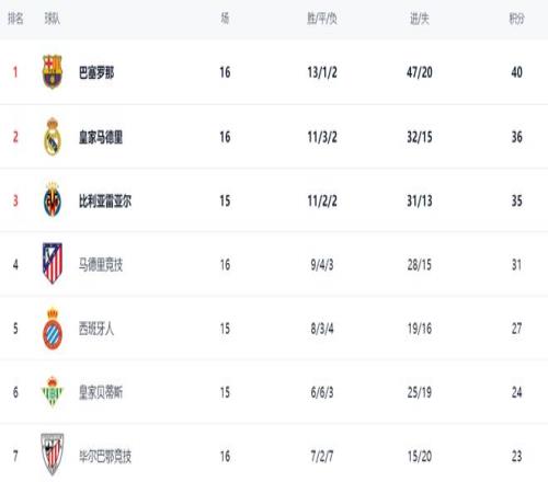 在积分榜上,巴萨以40分排名榜首。皇马依然停留在36分,排名第2。皇马连续5场联赛中赢了1场,让争冠前景不断恶化。阿隆索的帅位不稳了。比利亚雷亚尔以35分排名第3,接下来有希望超越皇马。马竞以31分排名第4。西班牙人总积分达到27分,排名第5。皇家贝蒂斯以24分排名第6。