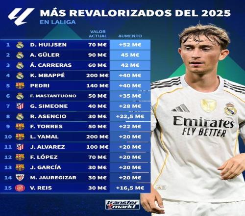 北京时间12月24日,德转列出了2025年身价涨幅最高的15名西甲球员,赫伊森一年时间身价暴涨5200万欧元高居第一,居莱尔上涨4500万欧元第二,阿尔瓦罗-卡雷拉斯上涨4200万欧元第三,姆巴佩和佩德里上涨4000万欧元并列第四。