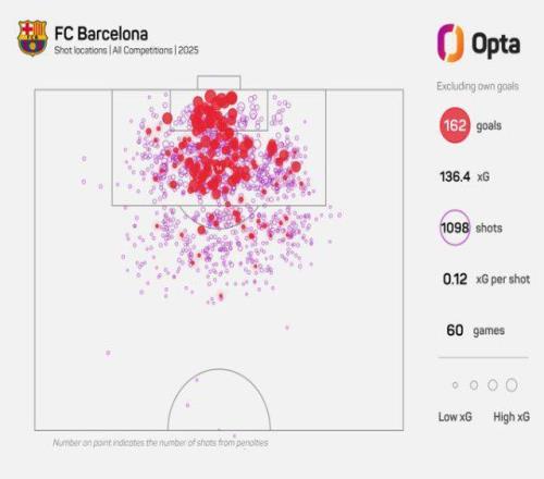 2025年落幕在即,Opta统计,巴萨在年内60场各线比赛之中打入169粒进球(乌龙球包含在内),缔造全新纪录:单一自然年内,阵中既无梅西也无C罗的情况下,西甲球队从未有过如此进球量。堪称张局。