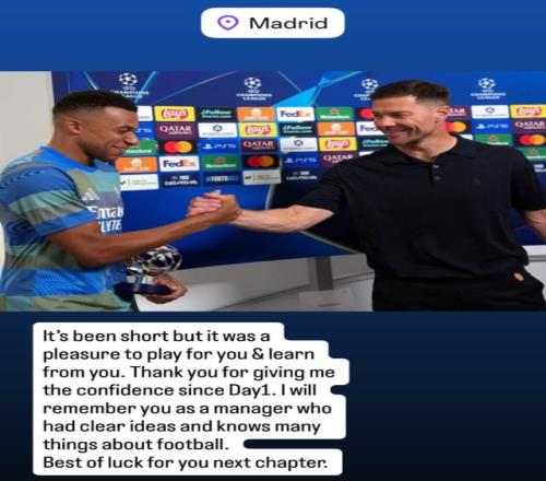 至于姆巴佩和阿隆索有没有矛盾,或许从一些细节上看似乎是的:比如决赛颁奖时刻,阿隆索招呼球员列队祝贺对手。但是姆巴佩等球员不愿意配合。——但其实这只是姆巴佩的个人性情因素,他和阿隆索之间没有龃龉。在阿隆索离开后,姆巴佩第一时间送去祝福:为你效力,尽管很短,但是感到荣幸。