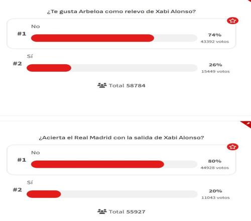 近日,皇马官网宣布阿隆索离任,并由卡斯蒂亚主帅阿韦洛亚接替。西班牙媒体《阿斯报》随后发起的球迷投票统计显示,截至目前约80%的球迷认为皇马解雇阿隆索是错误的决定。