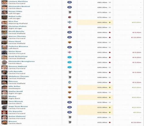 北京时间12月23日,意甲身价更新:劳塔罗8500万欧居首,尼科-帕斯涨至6500万欧。