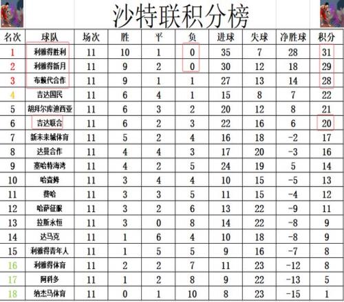 积分榜方面,利雅得胜利客场赢球后夺取8连胜,超过布赖代合作1分重回前2,将和榜首的利雅得胜利分差缩小到只差2分,冠军争夺是越来越激烈。卫冕冠军吉达联合今天也赢球了,但是他们还差前3有8分之多。