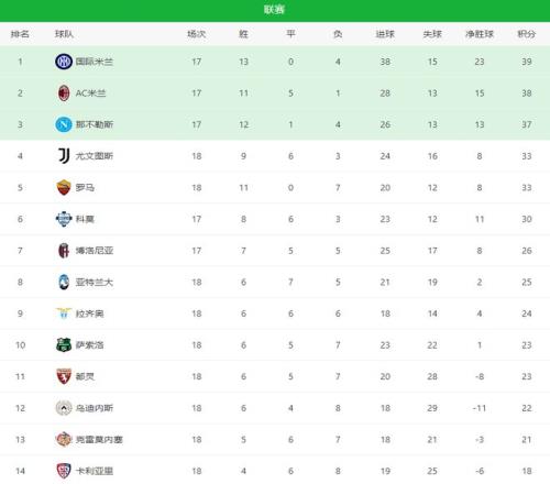 随着本轮多场比赛结束,意甲积分榜呈现出清晰的三层结构:米兰双雄依旧领跑,那不勒斯紧追不舍,欧战区与保级区的竞争则愈发残酷。