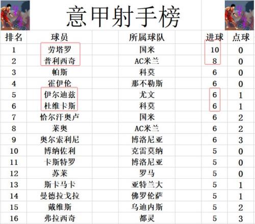射手榜方面,劳塔罗10球领跑,普利西奇8球位列第2,伊尔迪兹今天错失多次机会,被今天梅开二度的杜维卡斯追上,他们和霍伊伦,恰尔汗奥卢,莱奥,奥尔索利尼等人6球并列第3。