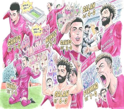 讲谈社正式发布了一幅特别漫画作品,定格了利物浦队史对阵曼联的最大比分胜利瞬间。2023年3月,在英超联赛的一场较量中,利物浦在安菲尔德球场以7-0的悬殊比分击败死敌曼联,震惊足坛。