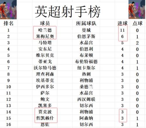 射手榜方面,哈兰德11球遥遥领先位居榜首,塞梅尼奥6球排在第2,马特塔5球排第3。贾克波3次中柱后破门,追上埃基蒂克,哲凯赖什等人10球刚好挤入前十。开场山脊破门的姆贝莫则是还差1球,才能进前十。