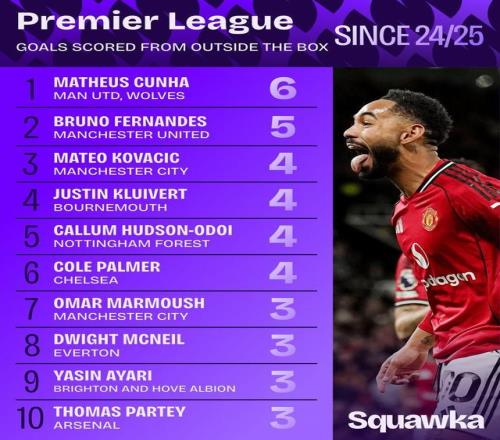 2024/25赛季以来禁区外进球最多球员榜单