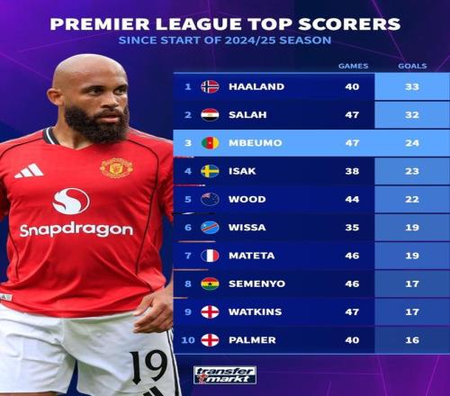 北京时间10月31日,德转统计出了上赛季至今英超联赛进球最多的10名球员,哈兰德33球排名第一,萨拉赫32球第二,本赛季为曼联在联赛中9场打进4球的姆伯莫位列第三。
