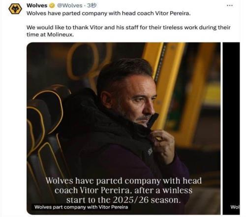 狼队官宣主帅佩雷拉下课:“狼队与主教练维托尔·佩雷拉分道扬镳。我们要感谢维托和他的团队在莫利纽球场工作期间的辛勤付出。”新赛季前10轮,狼队2平8负一场不胜排名垫底,在本轮0比3输给富勒姆后,俱乐部决定解除佩雷拉主帅职务。去年12月佩雷拉上任救火,各项赛事带队38场,14胜6平18负,胜率36.84%。佩雷拉是门德斯经纪公司旗下教练,今年9月,他刚与狼队续约到2028年,不过据悉其合同中有特殊条款,使得狼队无需赔偿合同内的全额薪水。