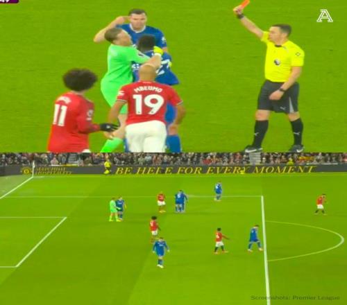 盖耶怒火遮眼打了队友一巴掌,随后基恩一掌推开。主裁托尼·哈林顿正好在附近目睹这一幕,他亮出红牌罚下36岁老将盖耶,VAR视频助理裁判保罗·霍华德也确认了这一判罚。基恩此时指着前额,讽刺队友不用脑,盖耶更为愤怒,被门将皮克福德牢牢抱住,才没有做出进一步的过激行为。