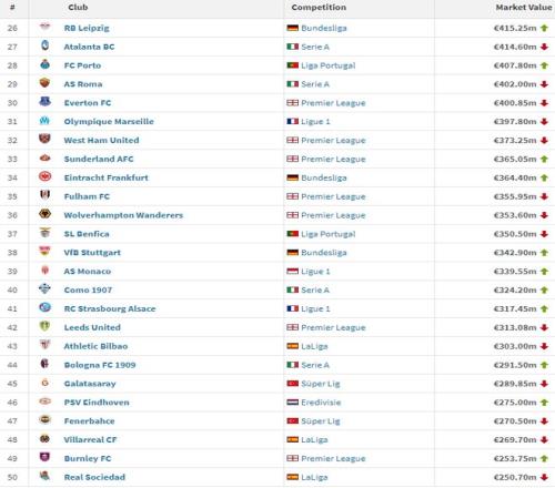 跻身前10的球队,还有排名第4位的巴黎圣日耳曼,排名第6位的巴萨以及排名第8位的拜仁。除了五大联赛球队之外,葡萄牙体育以4.63亿排名最高,但仅排名第23位。