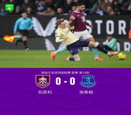 北京时间12月27日英格兰足球顶级联赛 联赛 第18轮,伯恩利主场对阵埃弗顿。上半场双方互有攻防,但都未能攻破对方球门。下半场,贝托脚后跟射门、阿尔卡拉斯倒钩射门均被杜布拉夫卡神奇化解。比赛尾声,杰登-安东尼送出斜塞,弗莱明推射击中立柱弹出,错失绝杀的机会。最终,伯恩利0-0战平埃弗顿。