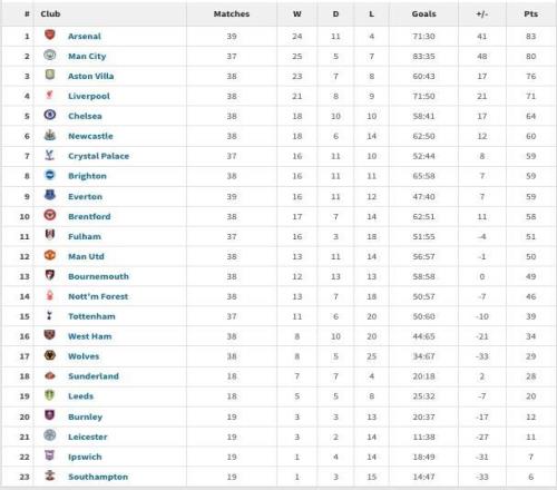 2025年英超所有比赛全部战罢,在年度积分榜上,阿森纳以83分位居榜首,曼城以80分排名第二,维拉位列第三,利物浦排名第四。