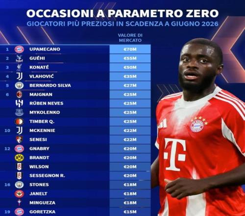 北京时间1月3日,德转统计出了现有合同今年6月到期的球员身价榜,拜仁中卫于帕梅卡诺7000万欧元高居第一,水晶宫中卫格伊5500万欧元第二,利物浦中卫科纳特5000万欧元第三。
