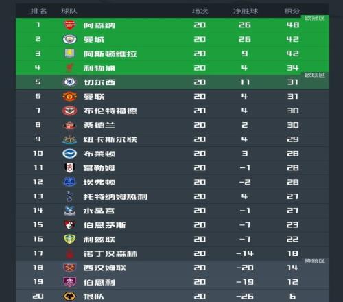 北京时间1月5日凌晨,随着切尔西在伤停补时阶段绝平曼城,英超第20轮的所有赛事全部结束;在最新的积分榜上,曼城连续2轮丢分,已经被阿森纳拉开了6分的优势;狼队赢得赛季首场胜利,终结了前19轮不胜的英超纪录;而第5到第14的球队之间仅仅相差4分。