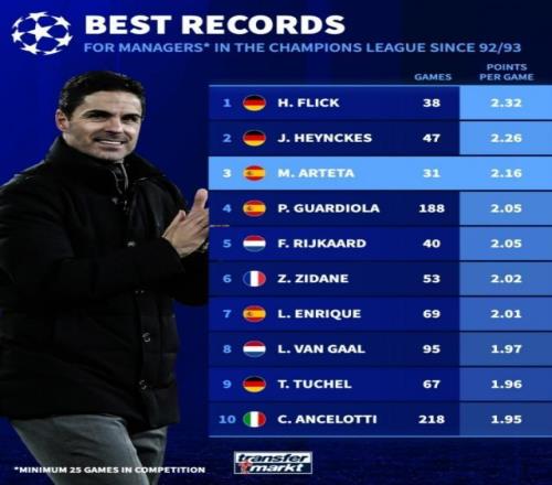 1月21报道 德转盘点了自92/93赛季欧冠改制以来,至少带队25场的主帅中场均积分榜,其中弗里克居首,具体如下: