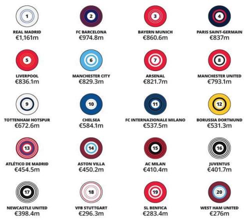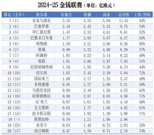 1月21日,德勤会计师事务所发布2024-25赛季金钱联赛报告,收录了上赛季世界足坛营收金额前20名俱乐部(以下简称“二十强”)的财政数据。