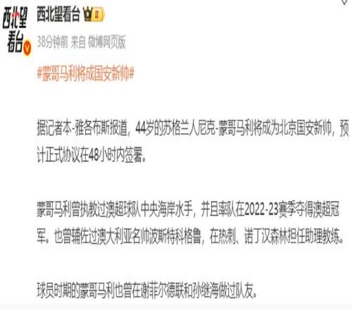 体坛周报记者王晓瑞也更新了最新的进展,表示蒙哥马利已经跟北京国安谈妥合同,达成执教意向。之所以还没有签约,是因为在“走流程、等批复”。