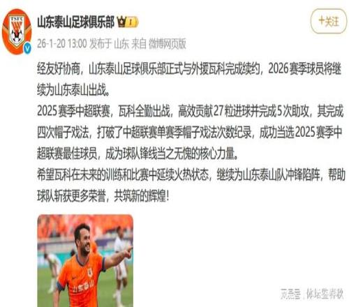 等了近2个月,靴子终于落地了!今日,山东泰山俱乐部官方确认,与外援前锋瓦科完成续约,合同延续至2026赛季结束。这条官宣一出,山东球迷群里瞬间热闹起来,有人长出一口气,也有人忍不住感叹一句,你们可算有点动静了。